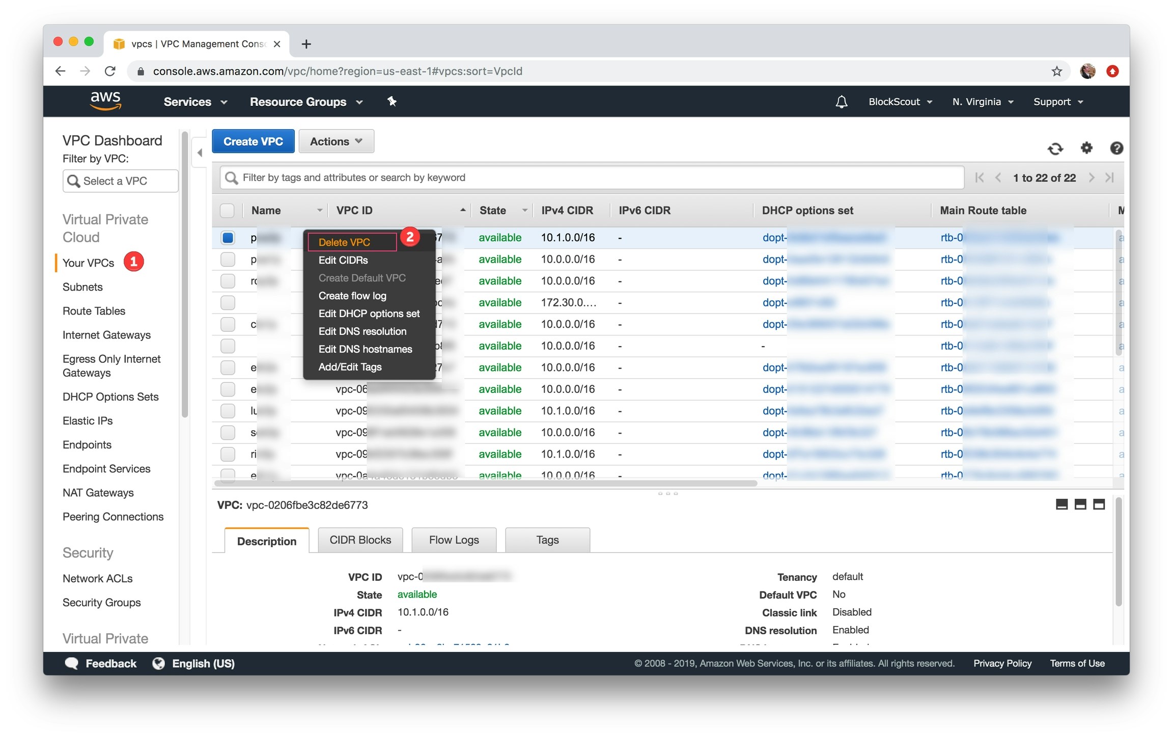 Select Your VPCs, select correct VPC, right click, select Delete VPC and confirm