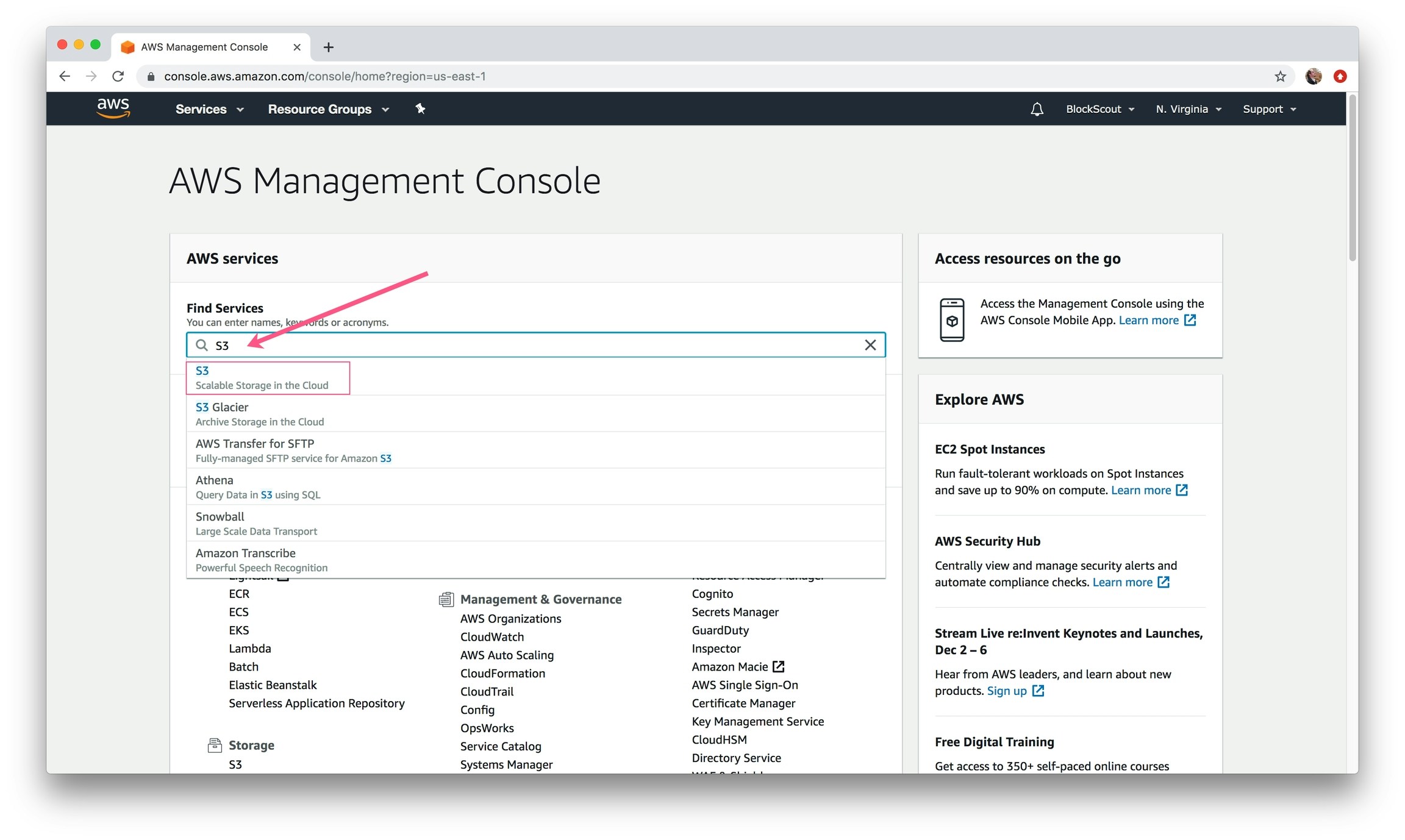 Enter S3 in the Find Services Search Box