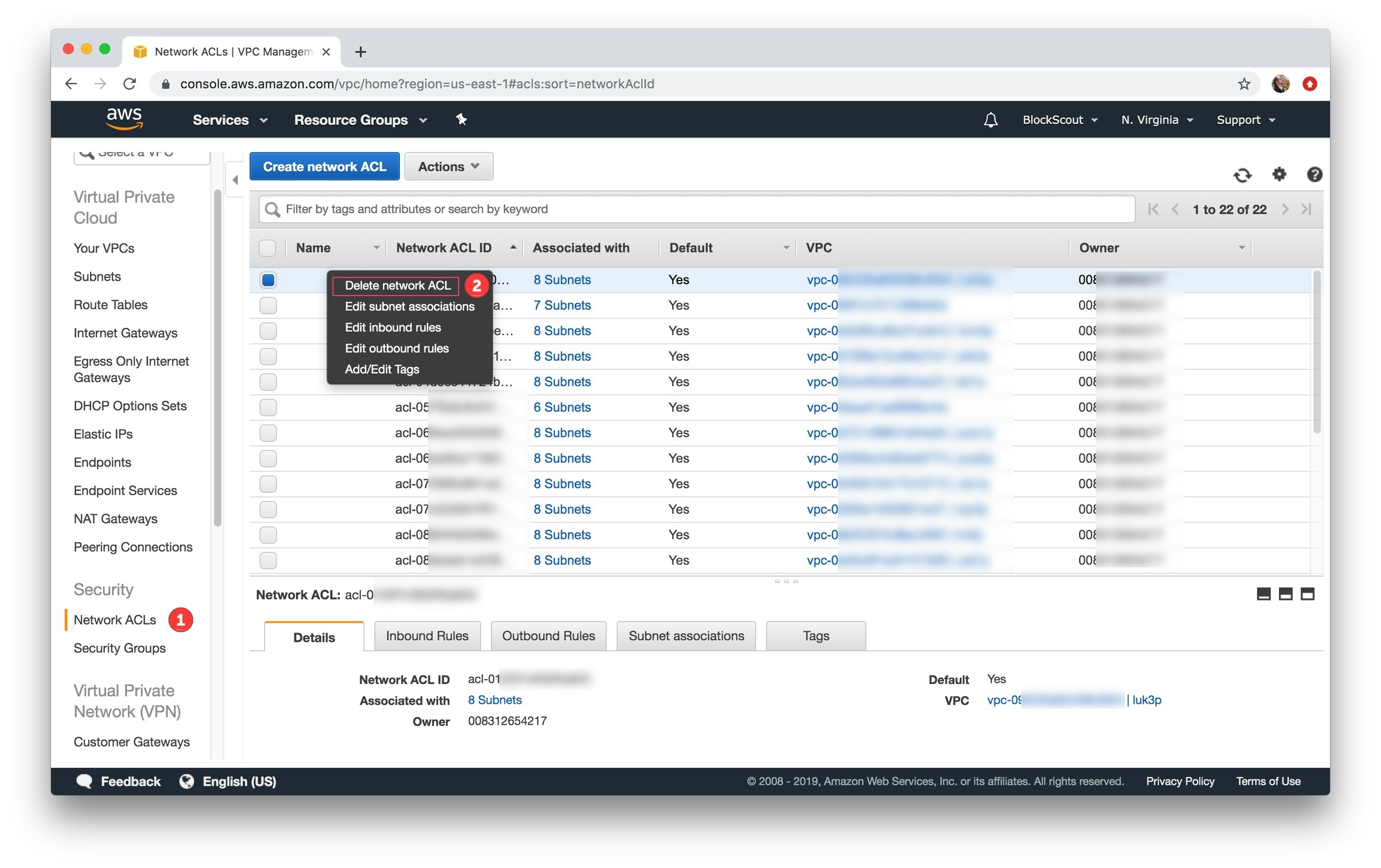 Select Network ACLs, select ACL to delete, right click, select Delete network ACL and confirm